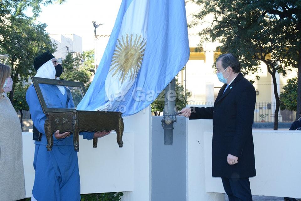 Al llegar a la plaza, el Dr. Gerardo Zamora junto a la Comitiva oficial participaron del izamiento de la bandera nacional.