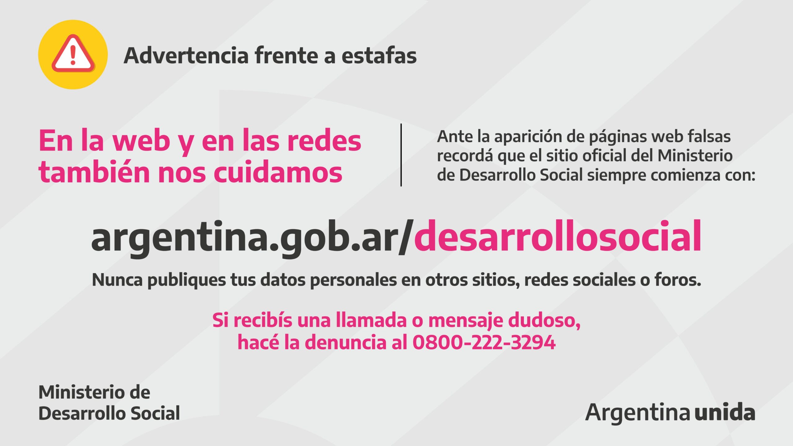 “Si te contactan para pedirte tus claves de cajero o de tu cuenta bancaria, hacé la denuncia al 0800-222-3294. También podés escribirnos a través de la web oficial del Ministerio: www.argentina.gob.ar/desarrollosocial”, subrayó el Gobierno.